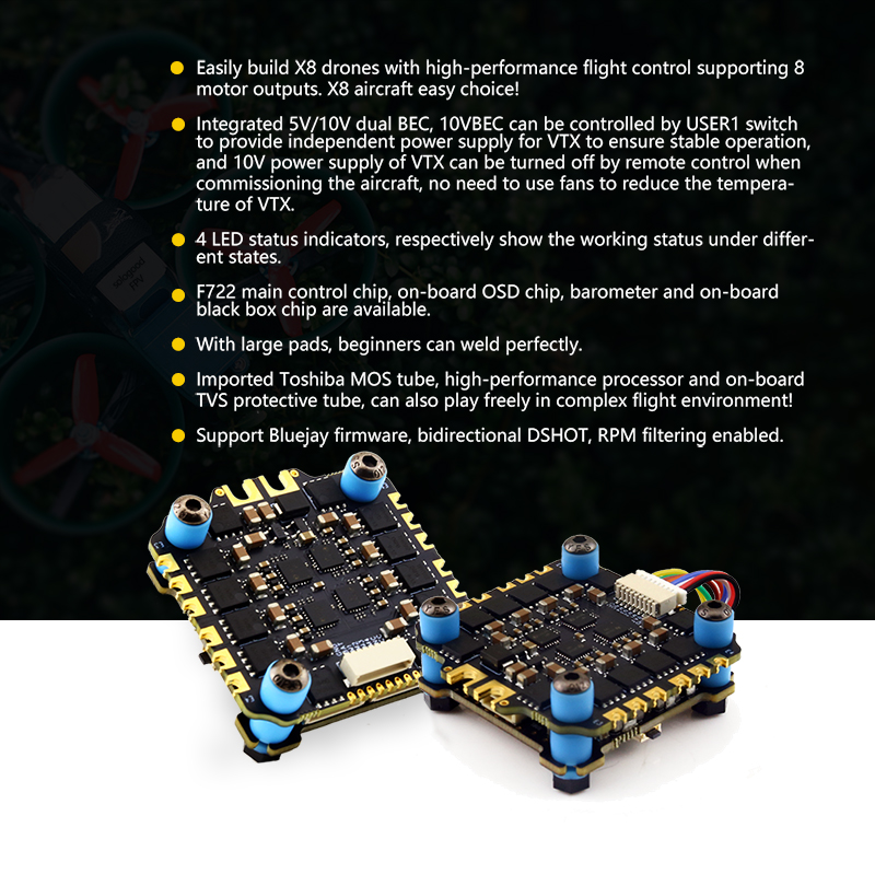 Although the flight control is small, it has all five internal components. The F722 main control chip, onboard OSD chip, barometer, and onboard black box chip.